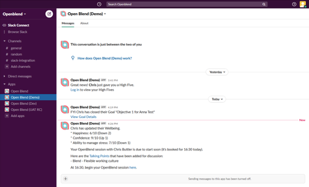 Similarly to our Microsoft Teams integration, our Slack Integration allows for users to receive notifications about upcoming sessions, manager/talent updates, and High Fives via our Slack bot.